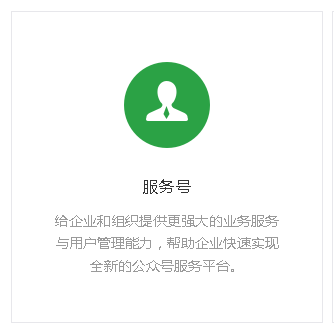 服务号:为企业和组织提供更强大的业务服务与用户管理能力,主要偏向服务类交互(功能类似12315,114,银行,提供绑定信息,服务交互的);